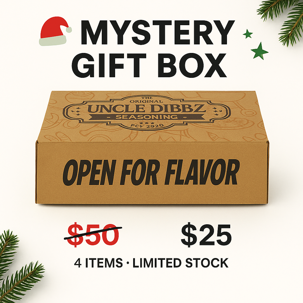 The Mystery Gift Box comes packed with 4 full-size Uncle Dibbz seasonings — pulled from best-sellers, retired blends, or limited leftovers.